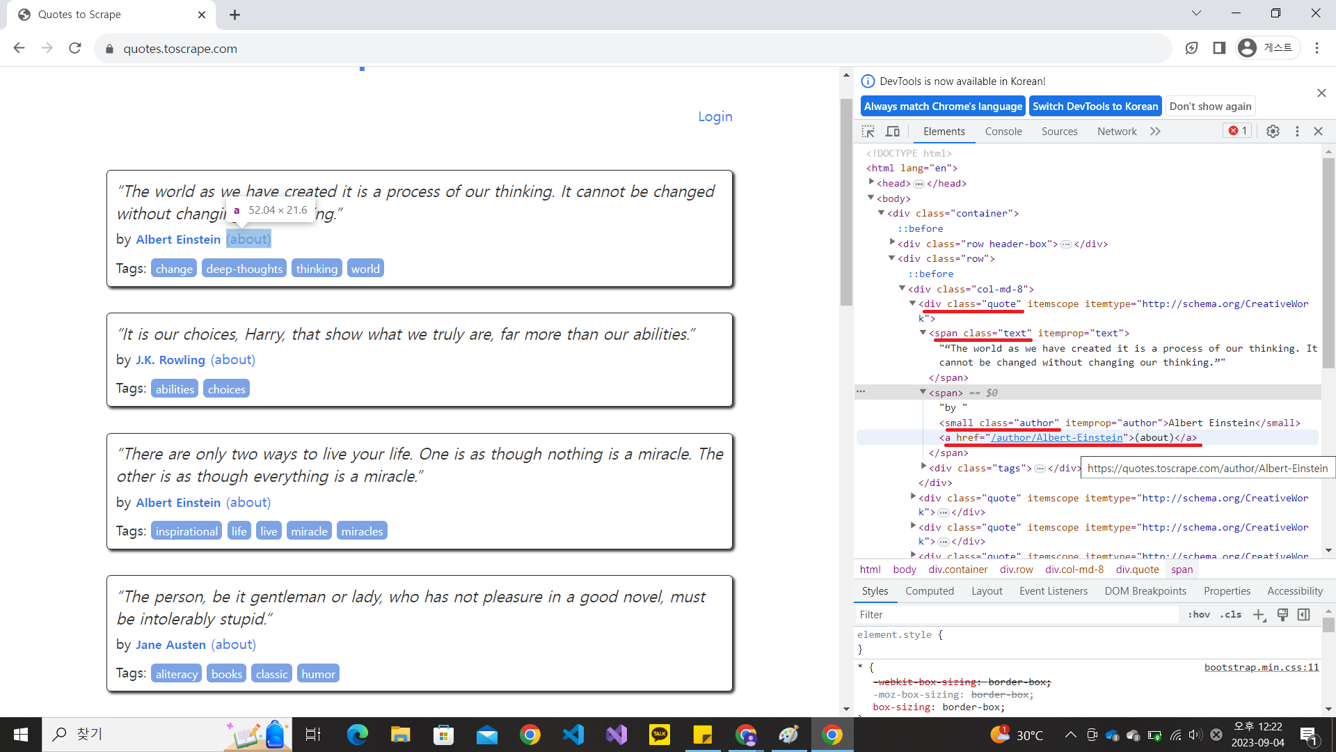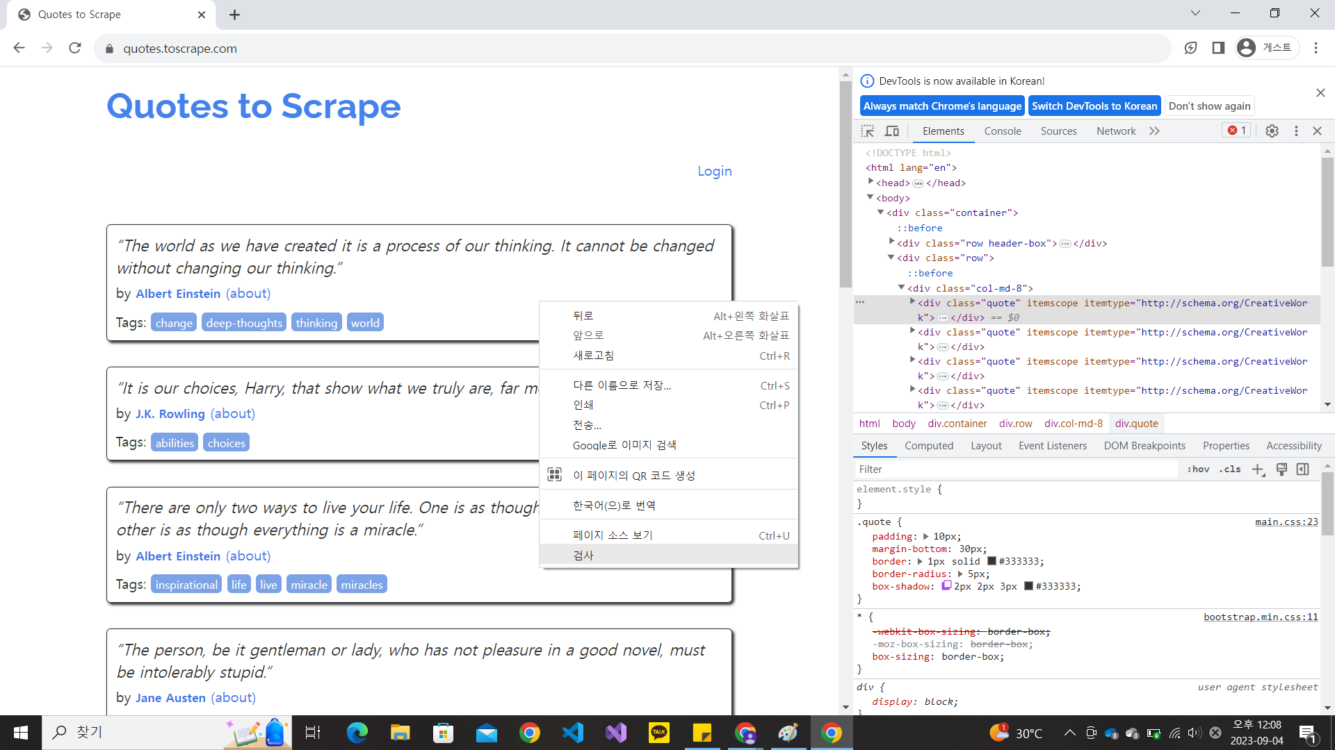 이제 크롤링 실습을 해보겠습니다. 웹 크롤링 연습으로 자주 사용되는 명언 인용 사이트를 이용하겠습니다.