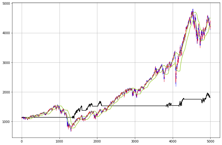 ax.plot(range(count), stock_data['lower'], color="yellowgreen")