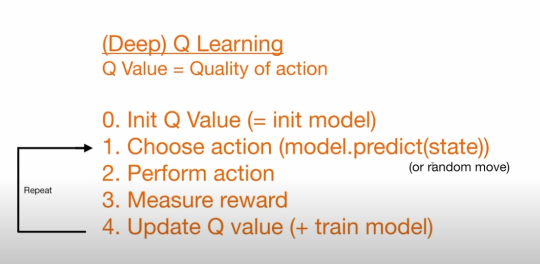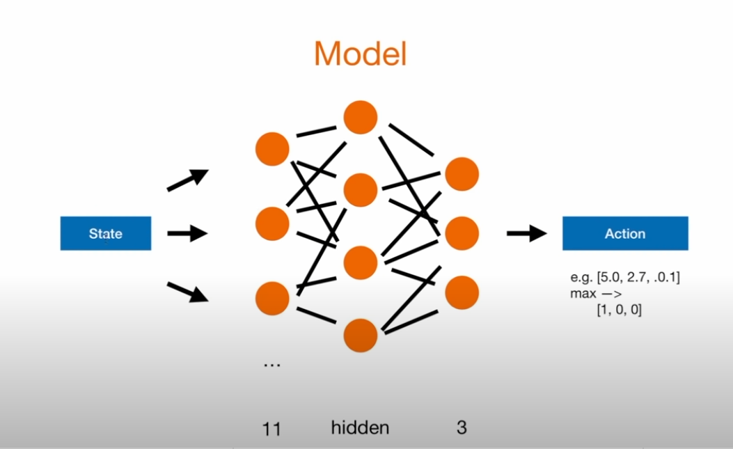 -모델파트: 강화학습에서 에이전트를 학습시키는 모델입니다. 모델의 방식은 다양하지만 저희는 파이토치를 통해 딥 q러닝 방식을 사용할 것입니다. 순방향 신경망(feedforward neural network) 이며 심층 신경망을 사용하여 행동을 예측함으로써 강화학습을 진행해나갑니다.